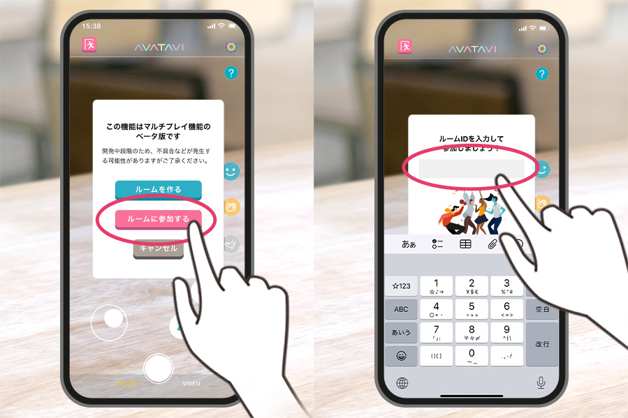 友達が先ににルームを作っている場合には、[ルームに参加する]を選択し、共有されているIDを入力して入室してください